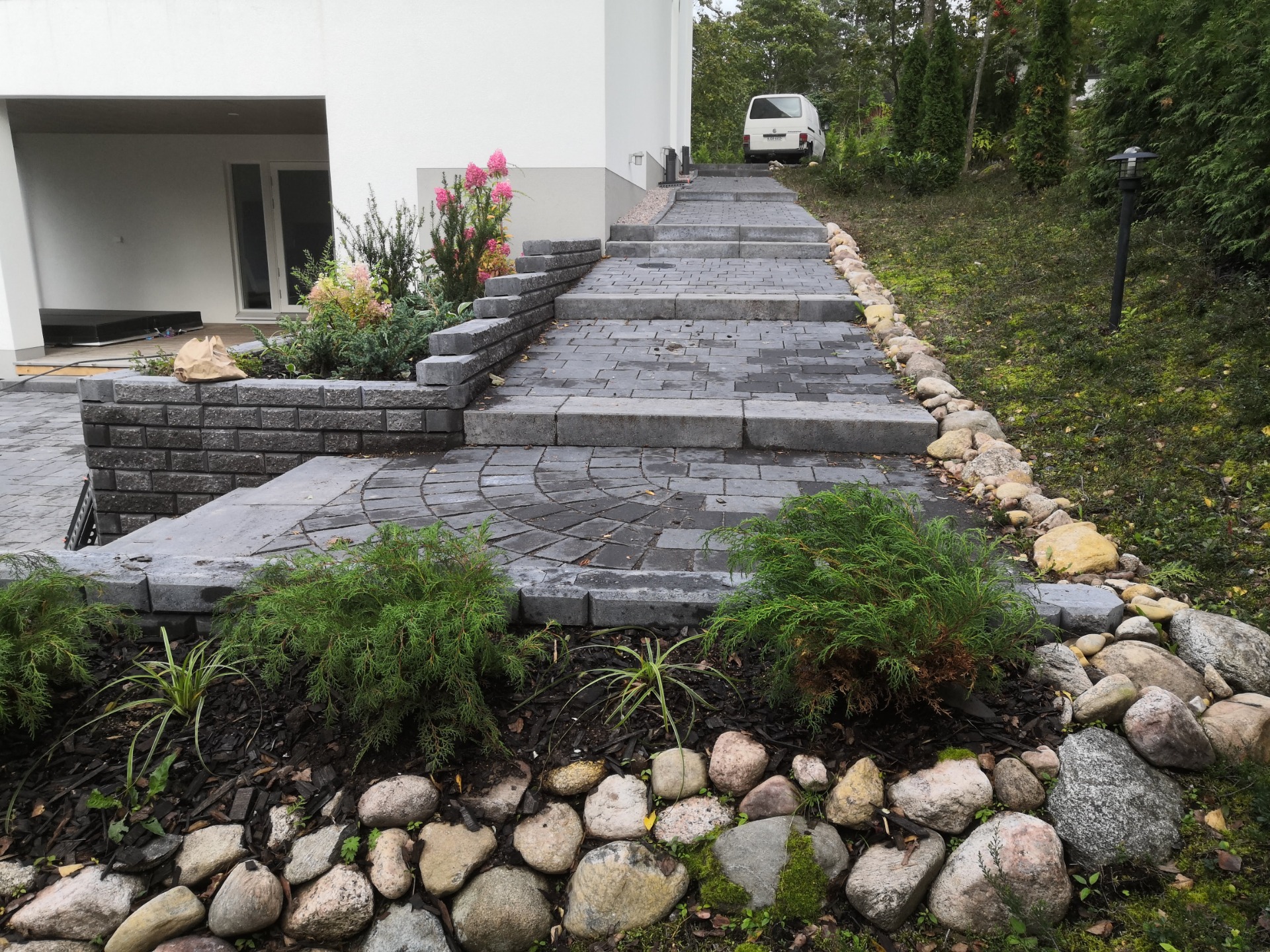Portaat, tukimuurit ja muu kiveys kannattaa suunnitella yhtenä kokonaisuutena. Samaa kivisarjaa tai sävymaailmaa käyttämällä saat harmonisen ilmeen, jossa kulkuväylät, oleskelualueet ja muurit liittyvät luontevasti toisiinsa. Saumoilla, ladontakuvioilla ja reunakivillä voidaan korostaa kulkusuuntia ja rajata eri toimintoja, kuitenkaan rikkomatta pihan yhtenäistä tyyliä.